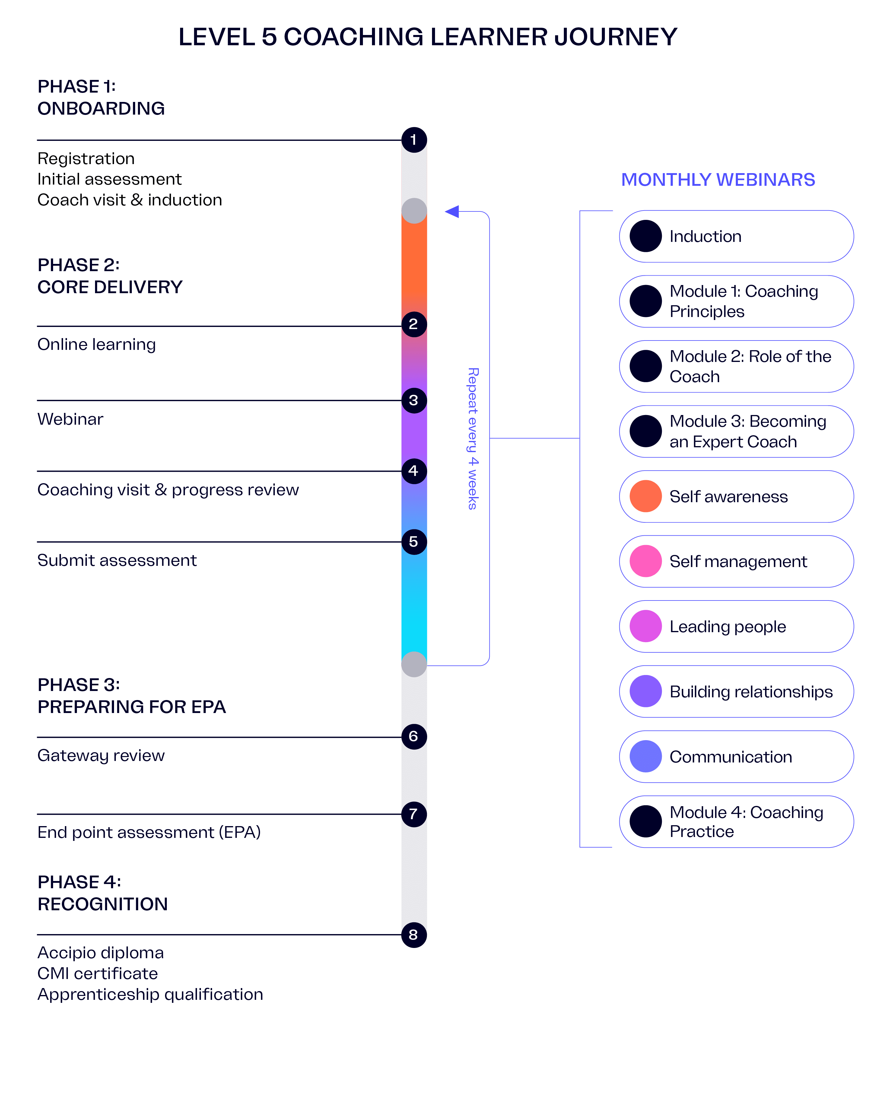 A vertical line labelled with key checkpoints during a Level 5 Coaching Apprenticeship.