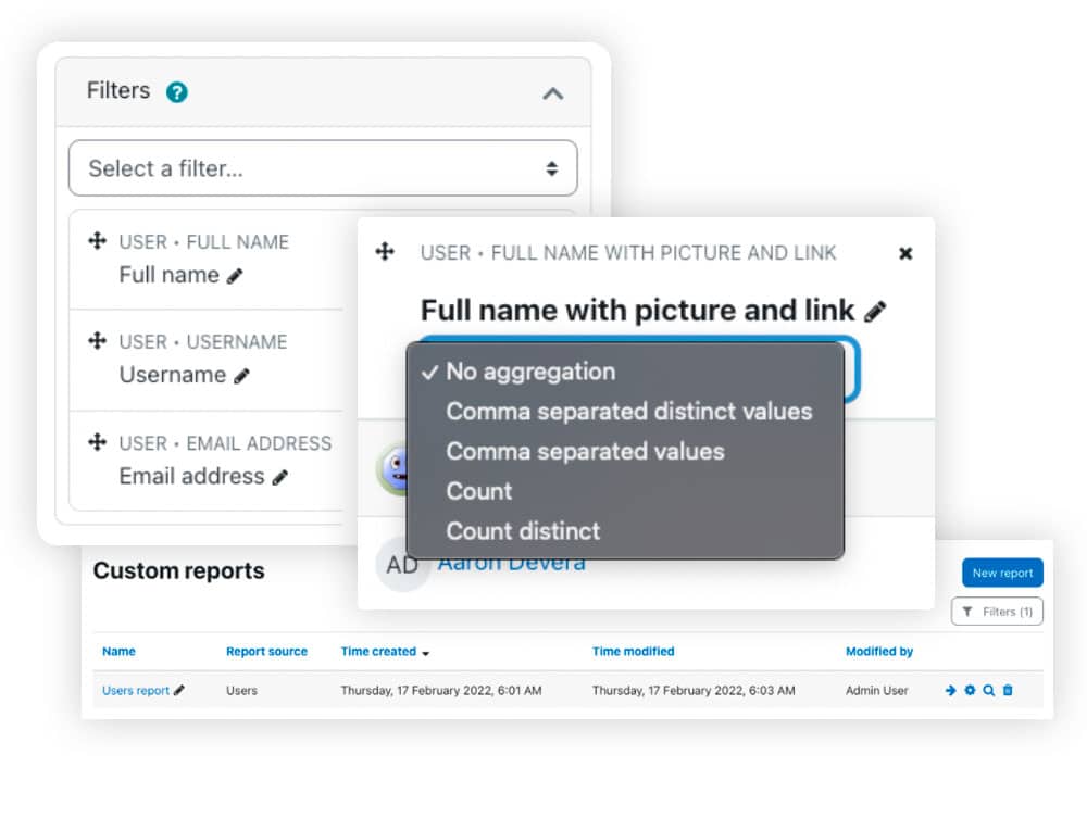 Moodle LMS 4.4 offers new custom reporting features with the data that matters most. The report builder features an intuitive drag and drop interface, with instant preview available, plus advanced filtering, and customisations.