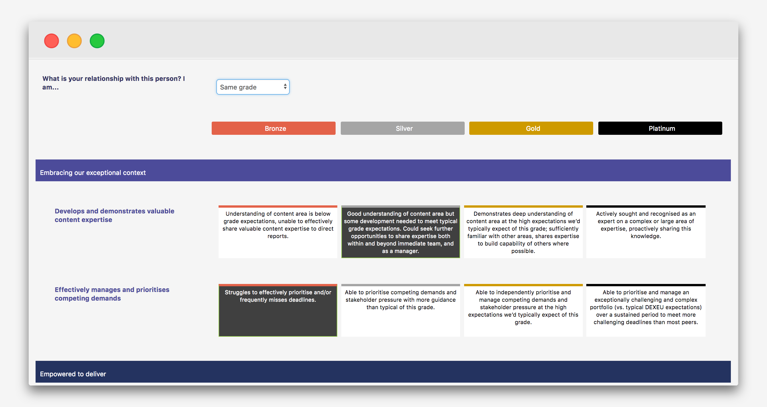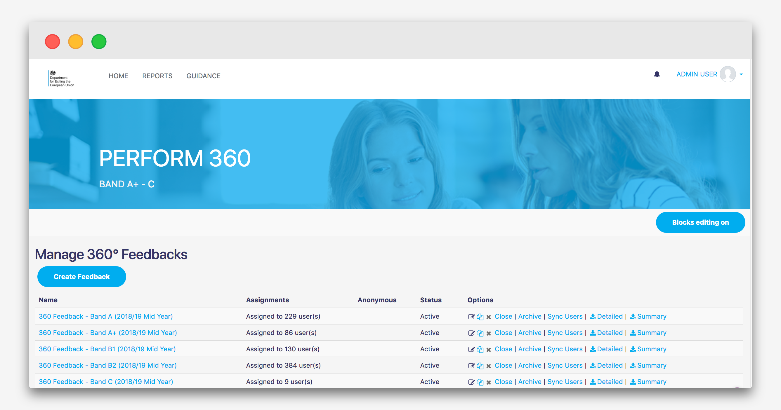 The Department for Exiting the European Union (DExEU) required a 360 platform which would be used as part of their new Performance Management approach. This online tool will support a culture of high performance throughout the year. The platform needed to allow users to gather and give feedback effectively and efficiently and to collaborate with multiple stakeholders digitally. The 360 tool will enable managers to select Performance and Talent markings for their staff mapped clearly against the department’s branded Performance Standards and the “9 box grid”.