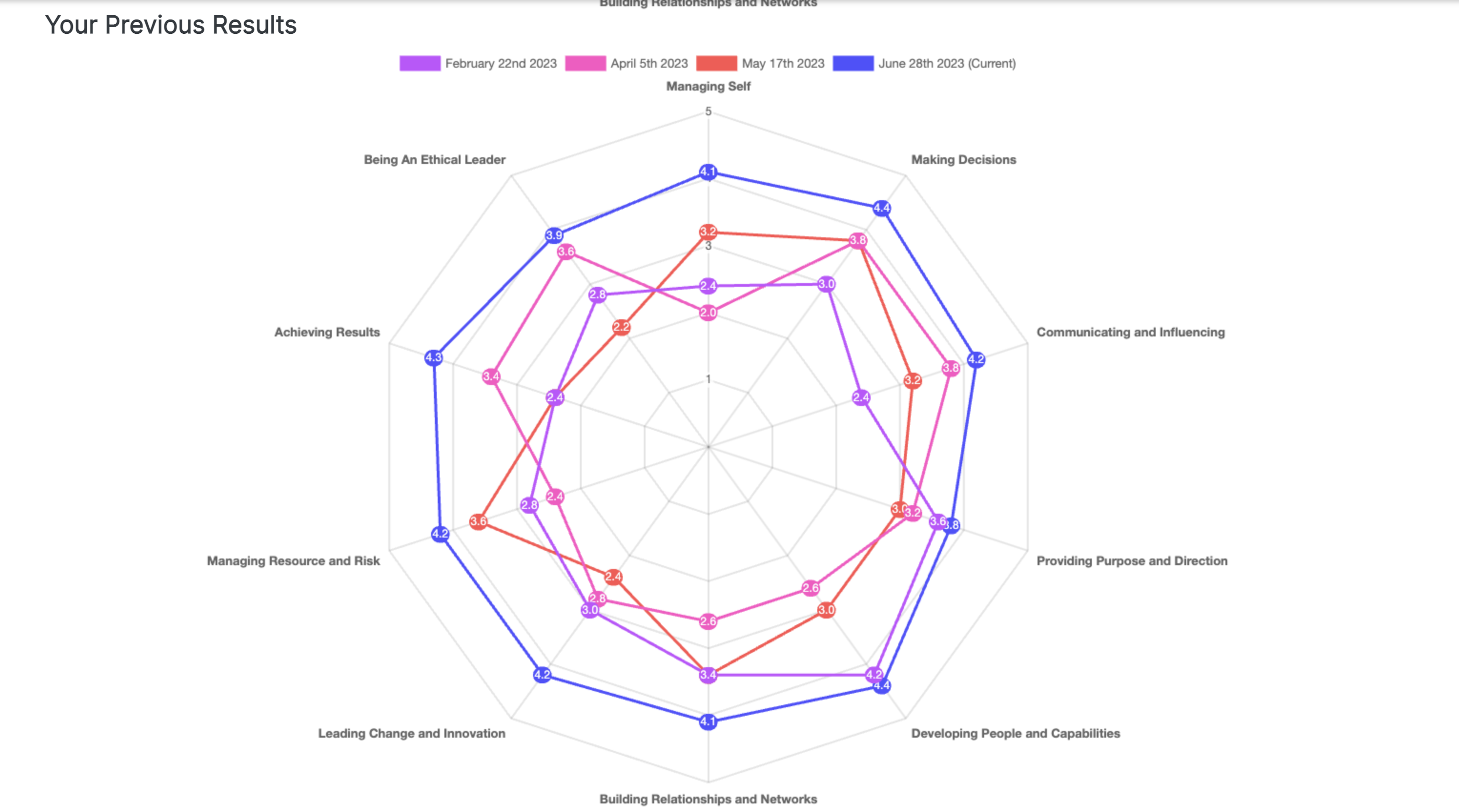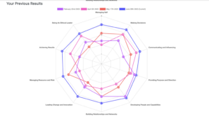 Screenshot of a spider diagram (series in pink, purple and blue) from a 360 framework.