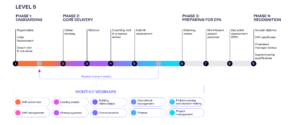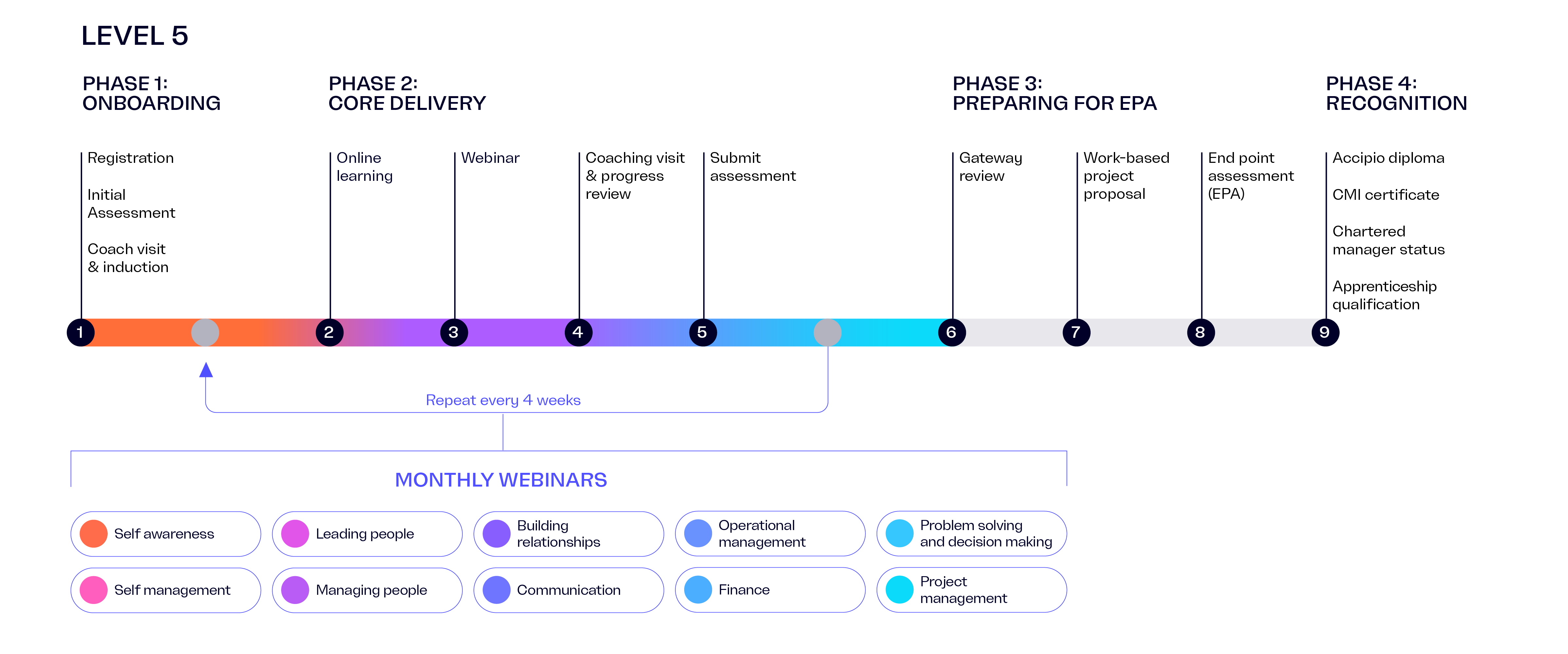 Delivery process for a L5 Management Apprentice illustrated as an line with regular phases and checkpoints.