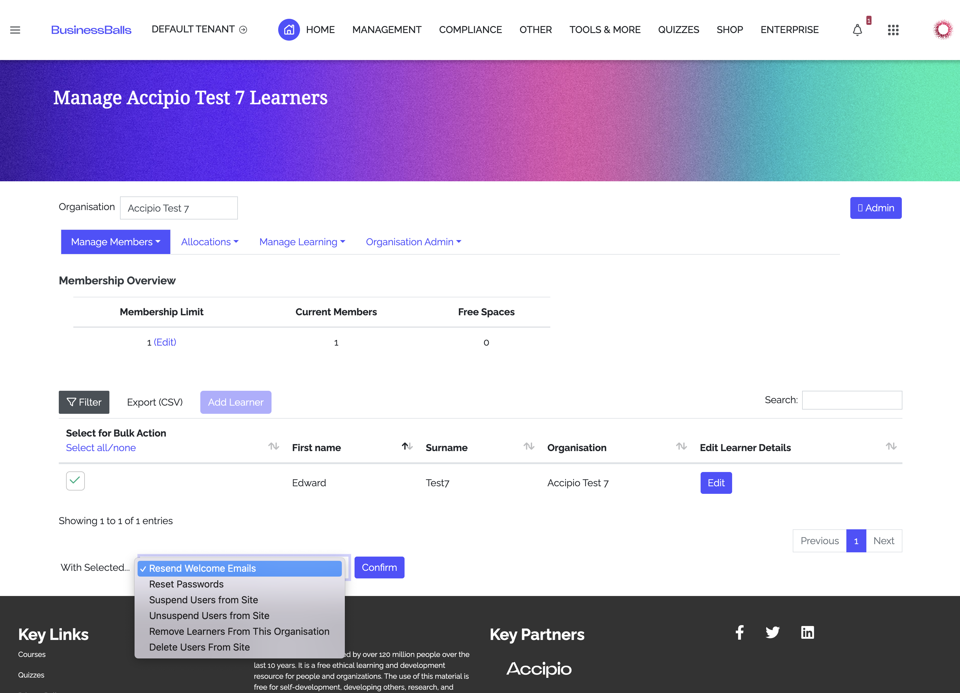 Screenshot showing how to send welcome emails to new members of a team within BusinessBalls Enterprise (an LMS).